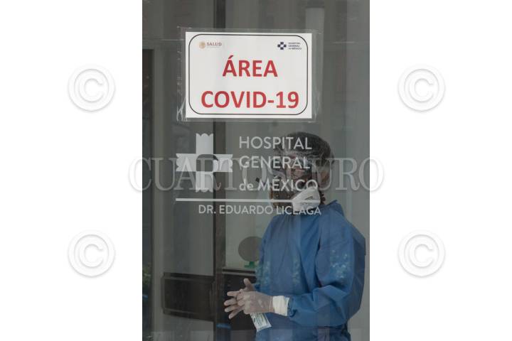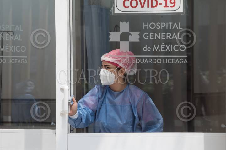 Una mujer médico sale por la puerta de la Zona Triage Respiratorio Covid-19 del Hospital General de México