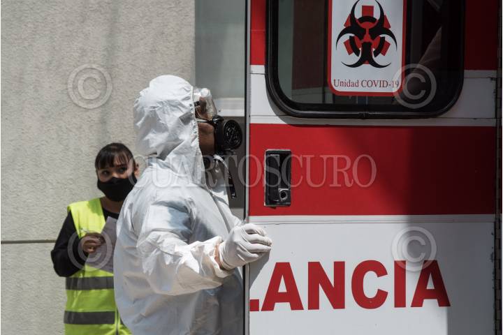 Un paramédico desciende de una ambulancia para ingresar un paciente con complicaciones por covid-19 en el Hospital Rodolfo Antonio de Mucha.