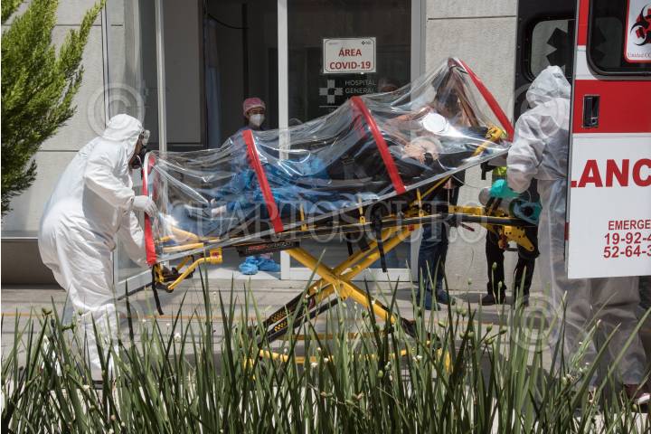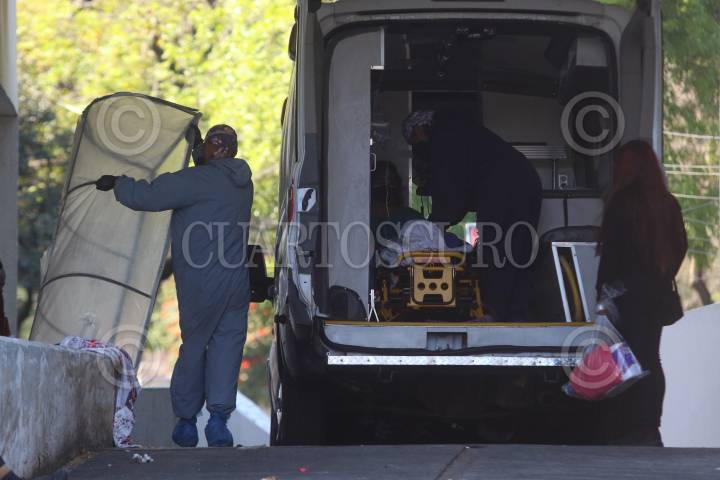 Paramédicos trasladan a un paciente con síntomas de Covid-19, al Hospital de los Venados IMSS.