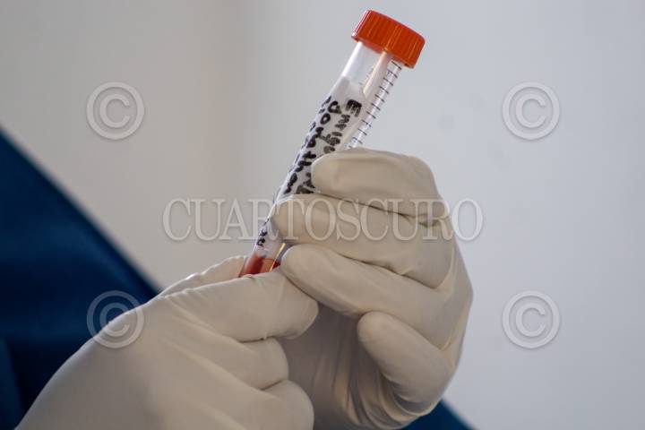 Personal de salud etiqueta una muestra para el análisis del test COVID-19