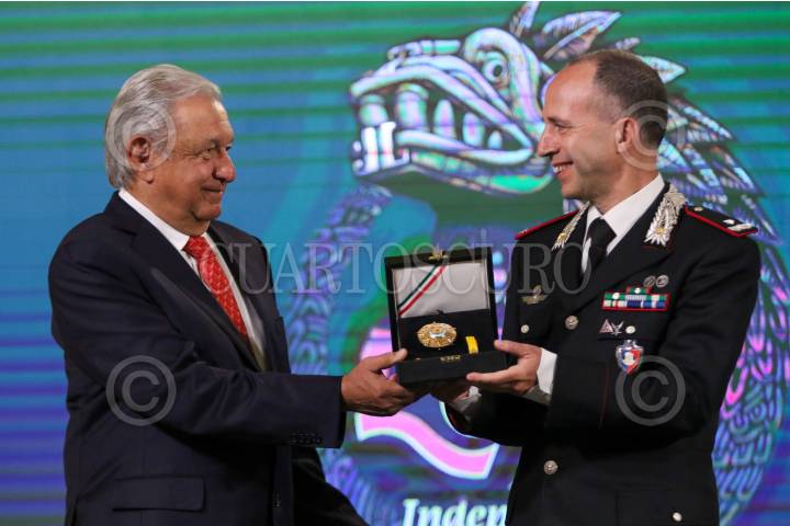 Roberto Riccardi, comandante de Carabineros para la Protección del Patrimonio Cultural de Italia, recibió la Orden Mexicana del Águila Azteca en grado de placa por parte de Andrés Manuel López Obrador, por su trabajo del rescate y recuperación de piezas prehispánicas en su natal Italia.