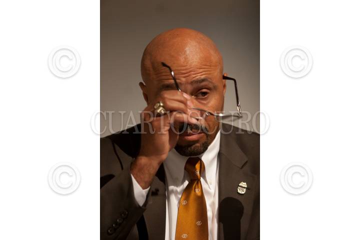 MÉXICO, D.F. 18JUNIO2012-El líder de Law Enforcement Against Prohibition (LEAP) Neill Franklin, expolicia y ahora activista de exmiembros de policas desaparecidos y muertos en la "guerra contra el narcotráfico" estadounidense, durante la conferencia de prensa encabezada por Javier Sicilia, y otros líderes de organizaciones civiles binacionales; quienes anunciarón la llamada "Caravan for Peace", que recorrera mas de 20 ciudades de los Estados Unidos, dando comienzo el 12 de agosto en San Diego, California y concluyendo 10 de septiembre en Washington DC. La caravana será encabezada por Javier Sicilia, acompañado de al rededor de 60 organizaciones. Busca hacer un llamado a la sociedad civil de ese país para evitar el tráfico ilegal de armas a México, así como generar soluciones al consumo de drogas y las políticas de castigo que se han implementado. FOTO: JUAN PABLO ZAMORA /CUARTOSCURO.COM