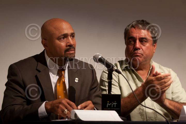 MÉXICO, D.F. 18JUNIO2012-El líder de Law Enforcement Against Prohibition (LEAP) Neill Franklin, expolicia y ahora activista de exmiembros de policas desaparecidos y muertos en la "guerra contra el narcotráfico" estadounidense, durante la conferencia de prensa encabezada por Javier Sicilia, y otros líderes de organizaciones civiles binacionales; quienes anunciarón la llamada "Caravan for Peace", que recorrera mas de 20 ciudades de los Estados Unidos, dando comienzo el 12 de agosto en San Diego, California y concluyendo 10 de septiembre en Washington DC. La caravana será encabezada por Javier Sicilia, acompañado de al rededor de 60 organizaciones. Busca hacer un llamado a la sociedad civil de ese país para evitar el tráfico ilegal de armas a México, así como generar soluciones al consumo de drogas y las políticas de castigo que se han implementado. En la foto Franklin es aplaudido por Enrique Morones, de la organización Border Angels, Premio Nacional de los derechos humanos México 2009. FOTO: JUAN PABLO ZAMORA /CUARTOSCURO.COM