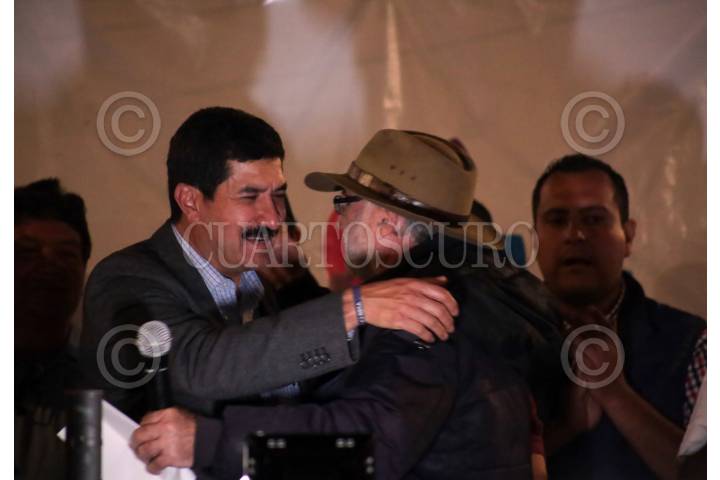 CUERNAVACA, MORELOS, 03FEBRERO2018.- Javier Corral, gobernador de Chihuahua, abraza a el poeta Javier Sicilia, durante el mitin de la “Caravana por la Dignidad Unidos con Valor“. La movilización llegara el próximo domingo a la Ciudad de México. FOTO: MARGARITO PÉREZ RETANA /CUARTOSCURO.COM