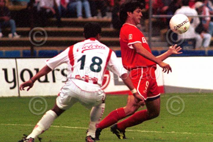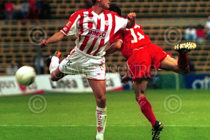 José Saturnino Cardoso pelea un balón por aire durante el primer partido de la final de la Copa Toyota Libertadores en el Estadio Azteca. FOTO: Pedro Mera/CURTOSCURO.COM