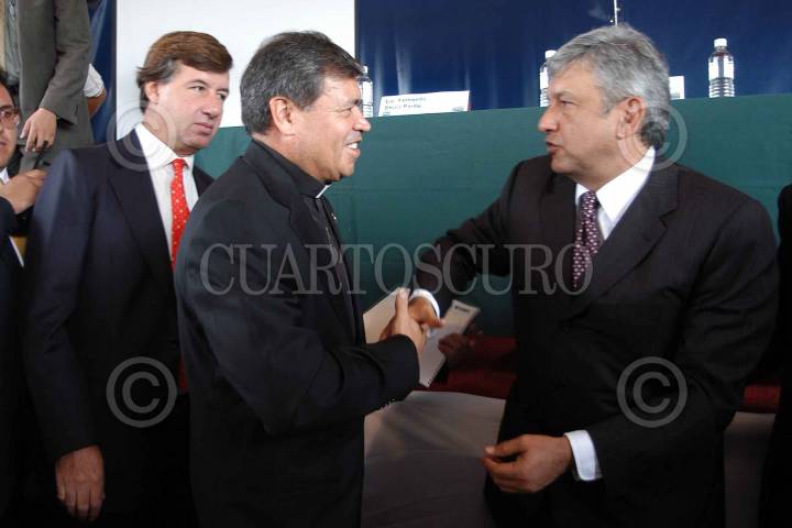 Fernando Chico Pardo observa el saludo entre el cardenal Norbeto Rivera y el jefe de gobierno Andrés Manuel López Obrador, durante el anuncio de construcción de la plaza Mariana. FOTO: Germán Romero/CUARTOSCURO.COM