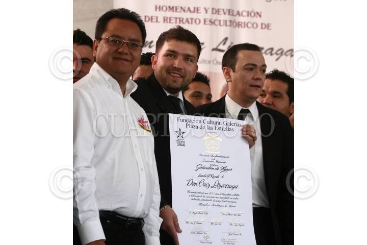 MÉXICO, D.F., 12MARZO2010.- Eduardo Santillan, delegado en Alvaro Obregón, Alfonso Lizarraga. vocalista del El Recodo y el presentador Eduardo Narvaez, durante el homenaje a "Cruz Lizarraga" que se realizó en la delegación Alvaro Obregón. FOTO: SAÚL LÓPEZ/CUARTOSCURO.COM