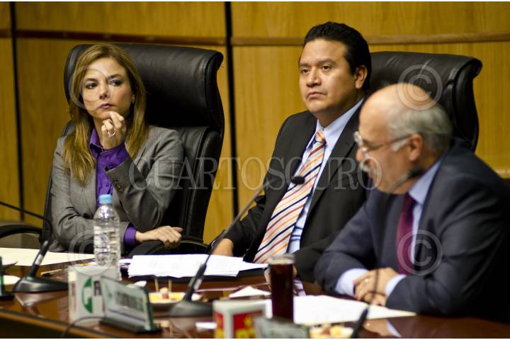 MÉXICO, D.F., 07OCTUBRE2011.- Carla Astrid Humphrey Jordan y Nestor Vargas Solano consejeros electorales del Instituto Electoral del Distrito Federal (IEDF), escuchan a Marco Antonio Michel Díaz (derecha), propietario suplente de la representación del Partido Revolucionario Institucional (PRI) en el IEDF, durante la sesión extraordinaria del Consejo General de este Instituto, en la que se hizo la "Declaratoria formal del inicio del Proceso Electoral Ordinario de 2011-2012". FOTO: MISAEL VALTIERRA/CUARTOSCURO.COM