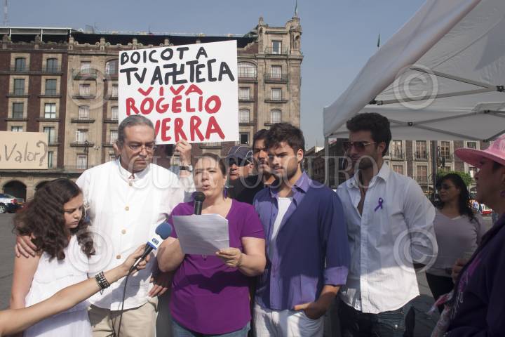 MÉXICO, D.F., 26MAYO2012.- El abogado, Alvaro Duarte Cue, la esposa del actor, Rogelio Guerra, la señora Maribel de Guerra y sus hijos, Carlo y Aldo Guerra explican con comunicado a los simpatizante del actor la razón por la cual no se presentó a la marcha convocada para este Sábado, en su apoyo debido a que Azteca Novelas le pidió al actor llegar a un acuerdo y que para que este llegara a buen término el debía desistirse de acudir al Zócalo esta mañana. Rogelio Guerra perdió un juicio contra la televisora del Ajusco por incumplimiento de contrato, por lo que la empresa se queda con el nombre artisitico de Hildegardo Francisco Guerra Martinez, su verdadero nombre, además deberá pagar una suma cercana a los 36 millones de pesos, por lo que estaban a punto de perder su casa por embargo de la televisora. La esposa de Rogelio Guerra agradeció las muestras de apoyo y pidio a los simpatizantes que acudieron a la plaza de la Constitución esperar a que concluyan las negociaciones. FOTO: FRANCISCO RODRÍGUEZ /CUARTOSCURO.COM