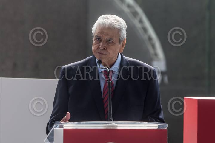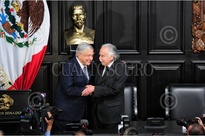 Carlos Payán Velver, periodista y fundador del periódico "La Jornada" falleció esta noche a las 94 años de edad, así lo confirmó el periódico "La Jornada" a través de sus redes sociales. En la imagen, Carlos Payán, junto a Andrés Manuel López Obrador, presidente de México, durante la sesión solemne en la que recibió la medalla Belisario Domínguez. FOTO: ARCHIVO/DIEGO SIMÓN SÁNCHEZ /CUARTOSCURO.COM
