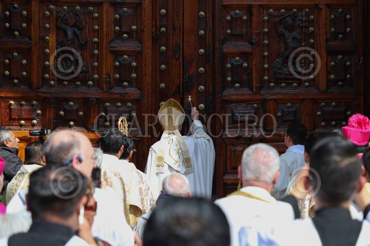 CIUDAD DE MÉXICO, 29DICIEMBRE2024.- El arzobispo primado de México, Carlos Aguiar Retes, abre la puerta principal de la Catedral Metropolitana luego de más de 20 años cerrada. FOTO: DANIEL AUGUSTO/ CUARTOSCURO.COM