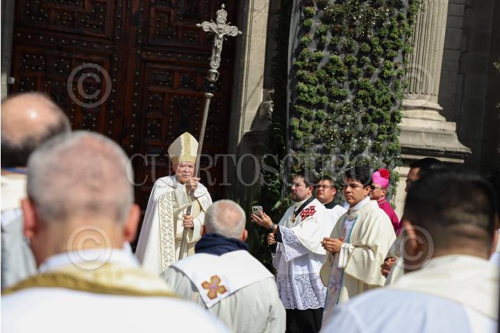CIUDAD DE MÉXICO, 29DICIEMBRE2024.- El arzobispo primado de México, Carlos Aguiar Retes, llega a la Catedral Metropolitana acompañado de obispos. FOTO: DANIEL AUGUSTO/ CUARTOSCURO.COM