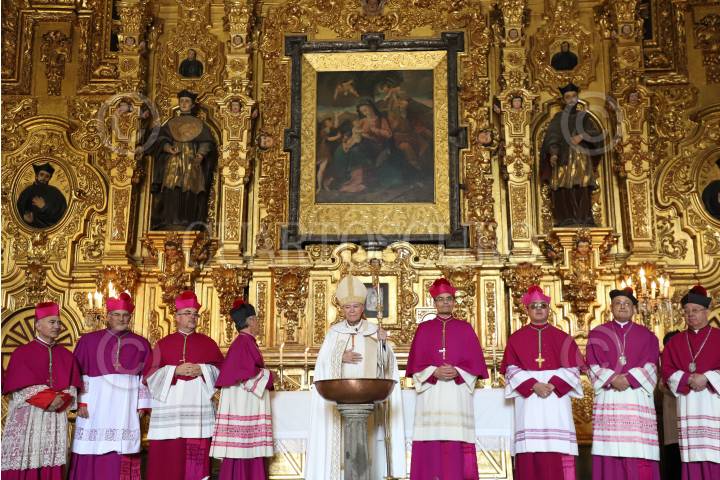 CIUDAD DE MÉXICO, 29DICIEMBRE2024.- El arzobispo primado de México, Carlos Aguiar Retes, ofrece agua bendita a los obispos que lo acompañan. FOTO: DANIEL AUGUSTO/ CUARTOSCURO.COM