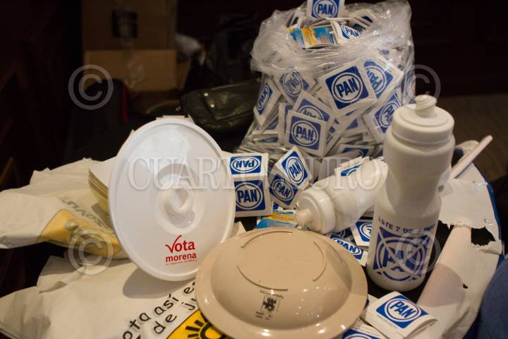 MÉXICO, D.F., 12MAYO2015.- Jesús Sesma, diputado de la ALDF y Arturo Escobar y Vega, coordinador de los diputados del PVEM, ofrecieron una conferencia de prensa señalaron que es inconstitucional la nueva sanción millonaria impuesta por el Instituto Nacional Electoral (INE) a su partido. La Comisión de Fiscalización del INE aprobó un proyecto que sanciona al PVEM con más de 300 millones de pesos por recibir aportaciones por parte de legisladores y grupos parlamentarios del propio partido. Los miembros del partido verde mostraron artículos proselitistas de otros partidos, como unos condones con la siglas del PAN, en los cuales no se señala que sean hechos con materia reciclado motivo por el cual también su partido ha sido multados. FOTO: MOISÉS PABLO /CUARTOSCURO.COM