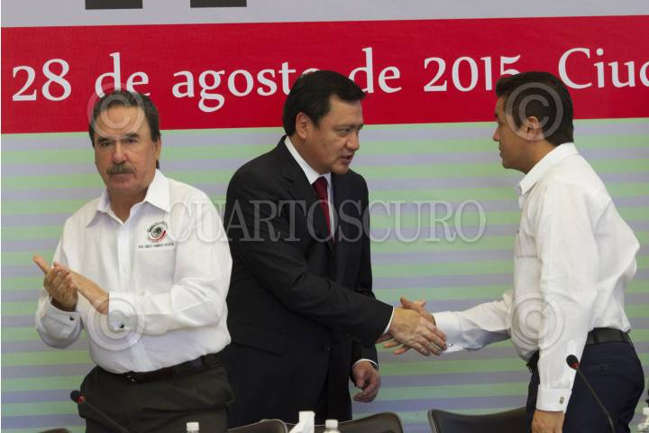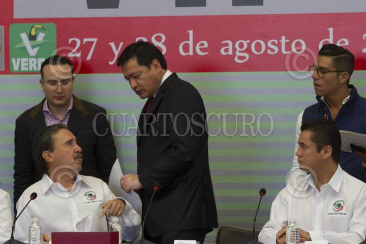 MÉXICO, D.F., 27AGOSTO2015.- Emilio Gamboa Patrón, coordinador de los senadores del PRI, Miguel Ángel Osorio Chong, secretario de Gobernación y Carlos Alberto Puente, coordinador de los senadores del PVEM, durante los trabajos de la VII Reunión Plenaria PRI-PVEM. FOTO: MOISÉS PABLO /CUARTOSCURO.COM