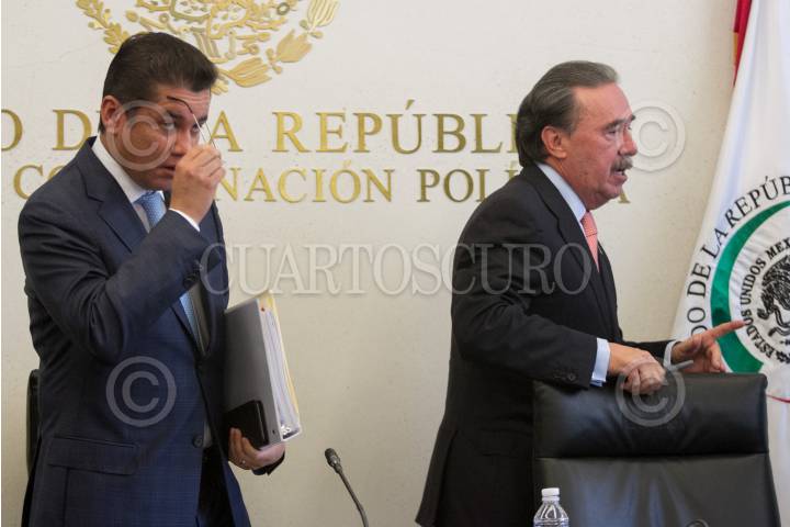 CIUDAD DE MÉXICO, 24OCTUBRE2017.- Los coordinadores Emilio Gamboa (PRI) y Carlos Alberto Puente Salas (PVEM), ofrecieron una conferencia de prensa tras concluir una reunión de la Junta de Coordinación Política del Senado, en donde se discutió el formato de la reunión de trabajo con Santiago Nieto, titular de la Fepade, quien fue removido por el encargado de despacho de la PGR, Alberto Elías Beltrán, para el día de mañana. FOTO: MOISÉS PABLO /CUARTOSCURO.COM
