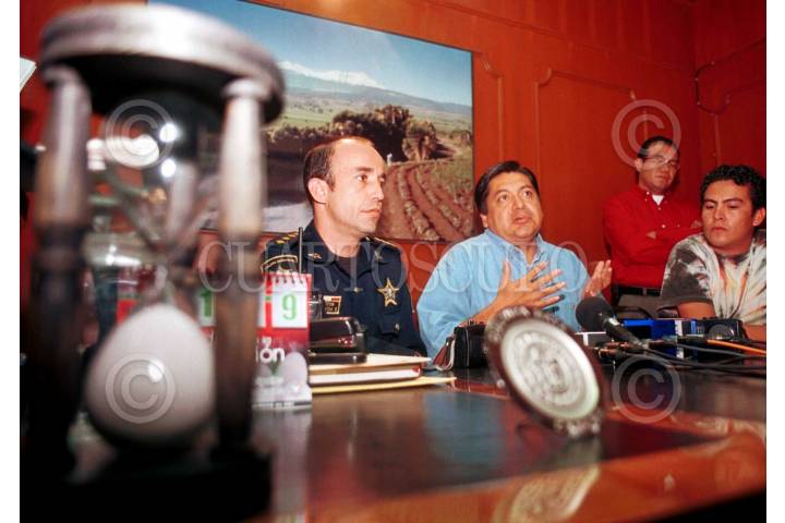 Carlos García, director de la policia municipal, Hectór Miguel Bautista, edil de Nezahualcoyotl y Eduardo Cabello, cuarto regidor, en conferencia de prensa, anunciaron que estan dispuestos a ser investigados por parte de la Procuradoria General de la República por el caso del llamado " Cartél de Neza". Confirman los procuradores general y del Estado de Meexico, Rafael Macedo de la Concha, y Alfonso Navarrete que la banda de Delia Patricia Buendía alias "Ma Baker" es una célula de los Arellano Félix.. FOTO: Oswaldo Ramírez/CUARTOSCURO.COM