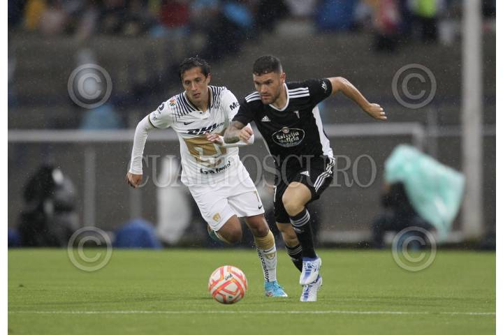 Carlos Gutiérrez de Pumas y Galán del Celta de Vigo disputan un balón durante el partido amistoso de fútbol entre Pumas vs Celta de Vigo, como parte de la gira del equipo español por Norteamérica, disputado en el estadio Olímpico Universitario.