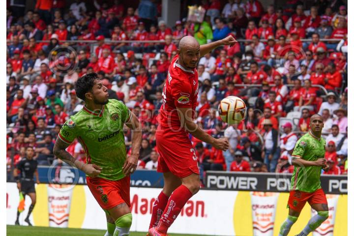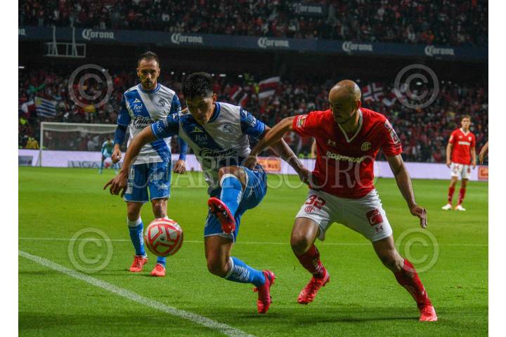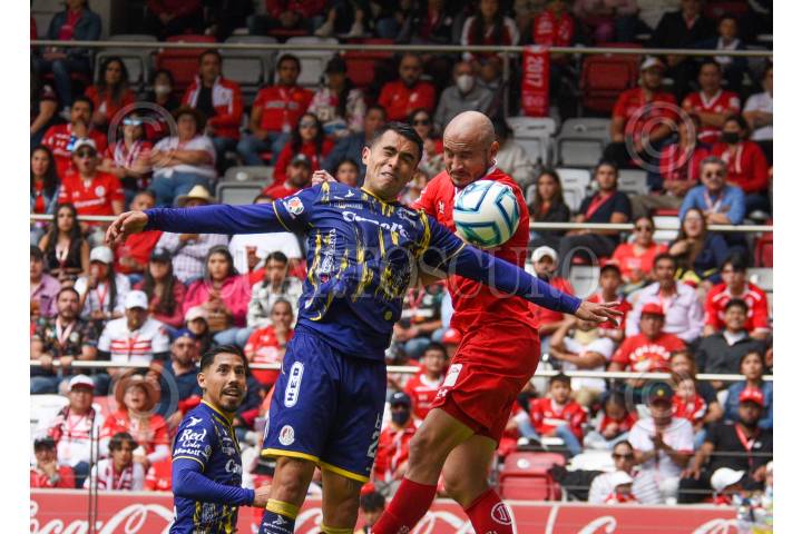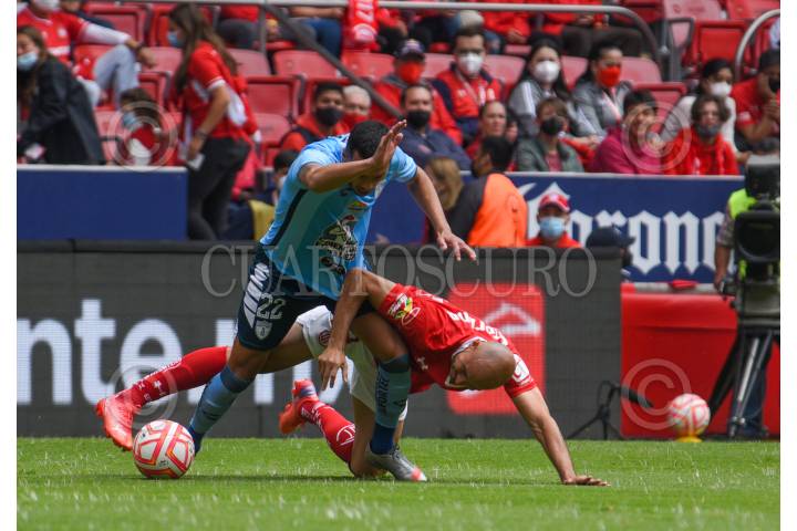 Ivo Vázquez defensa de la Franja de Puebla y Carlos González delantero de los Diablos de Toluca durante la jornada 16 del Torneo Apertura 2022.