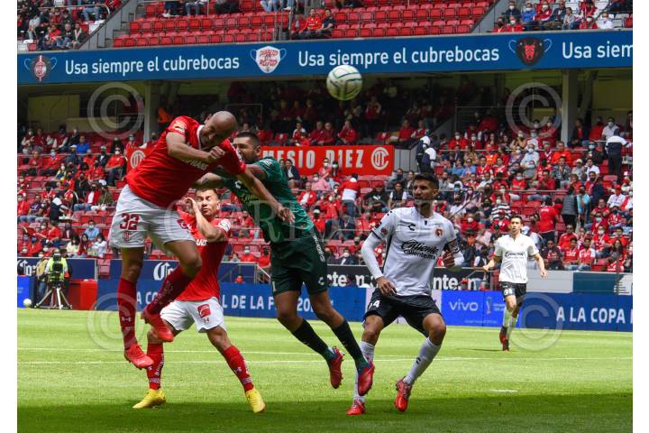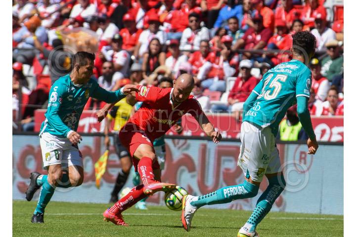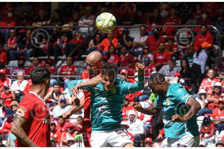 Paul Bellón defensa de León pelea el esférico con Carlos González delantero de los Diablos de Toluca durante el encuentro en el estadio Nemesio Diez.