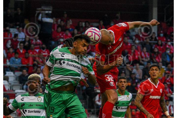 Eduardo Aguirre Delantero de Santos Laguna pelea el esférico con Carlos González delantero de los Diablos del Toluca.
