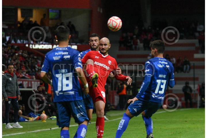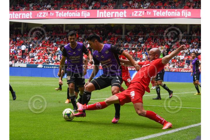 Carlos González delantero de los Diablos de Toluca pelea el esférico ante Roberto Meráz medio Mazatlán en el encuentro en el estadio Nemesio Diez.