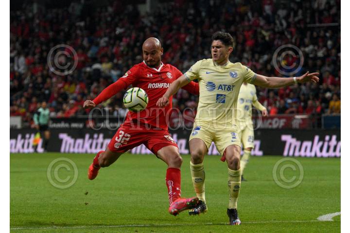 Carlos González delantero de los Diablos de Toluca e Israel Reyes defensa de las Águilas del América durante la jornada 2 del Torneo Clausura 2023.