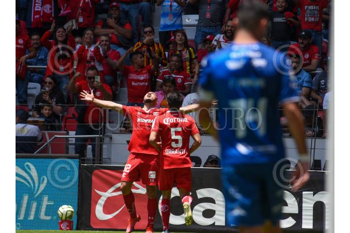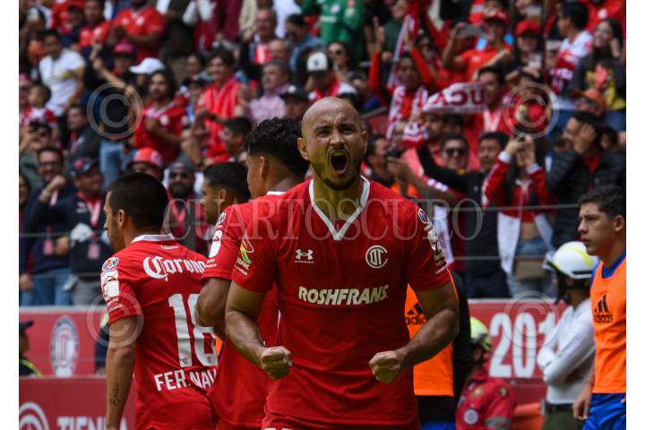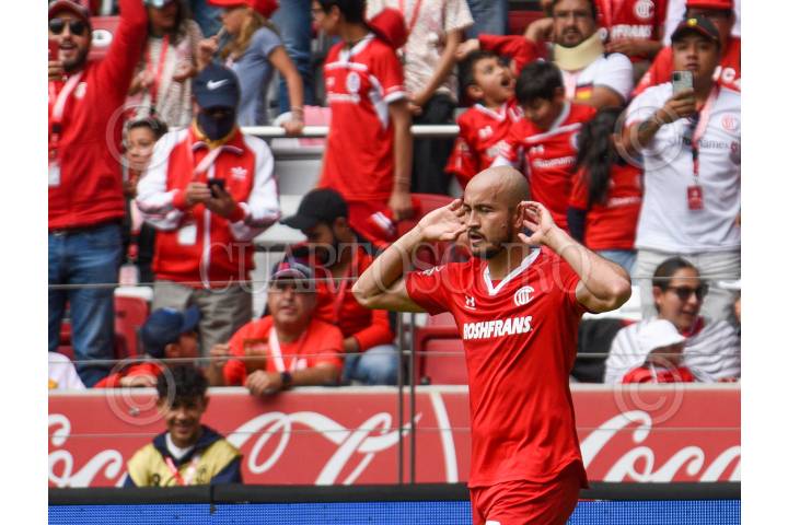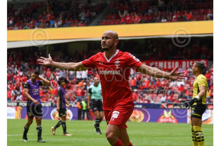 Carlos González delantero de los Diablos de Toluca celebra su anotación ante la escuadra de Mazatlán en el estadio Nemesio Diez.