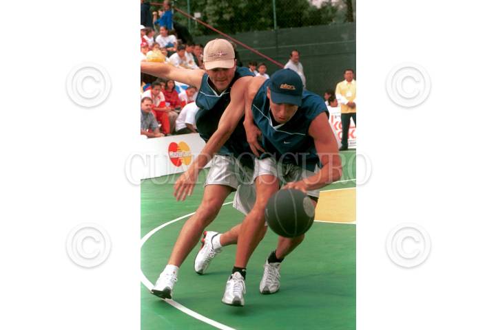 El futbolista Carlos Hermosillo y el velocista Alejandro Cárdenas compiten en la disciplina de basquetbol, en el marco del evento "Super estrellas" FOTO:Pedro Mera/CUARTOSCURO.COM