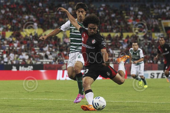 GUADALAJARA, JALISCO, 30AGOSTO2014.- Esta noche en el Estadio Jalisco de esta y en partido correspondiente a la Jornada 7 del Torneo Apertura 2014 de la Liga MX, se enfrentan los equipos de los Zorros del Atlas frente a Santos Laguna de Torreón. En la imagen el jugador del Atlas Enrique Esqueda disputa un balón frente al contrario de Santos, Carlos Izquierdoz. FOTO: FERNANDO CARRANZA GARCIA /CUARTOSCURO.COM