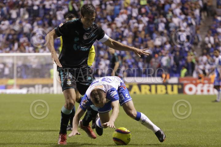 PUEBLA, PUEBLA, 16MARZO2018.- Los jugadores Alejandro Chumacero y Roberto Izquierdoz disputan el balón durante jugada del partido correspondiente a la jornada 12 del torneo Clausura 2018 de la Liga MX celebrado en el estadio Cuauhtémoc con triunfo a favor de los visitantes. FOTO: HILDA RÍOS /CUARTOSCURO.COM