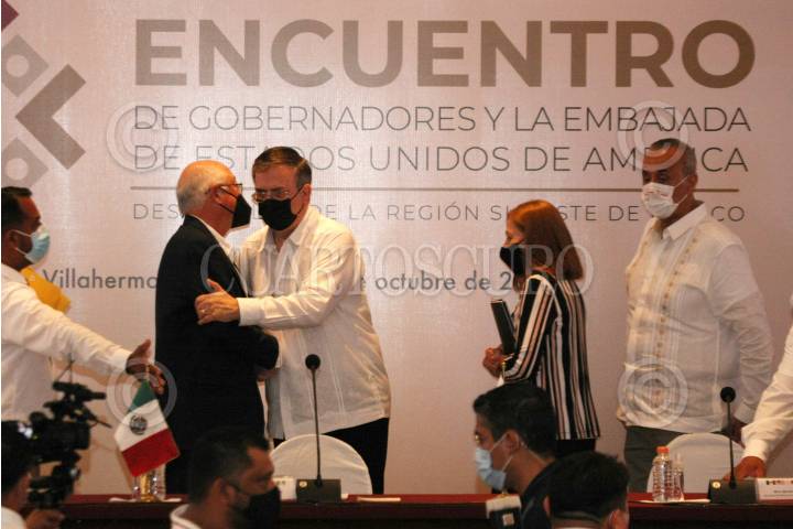 Marcelo Ebrard y Carlos Manuel Merino durante la reunión con el embalajador Ken Salazar durante la reunión de gobernadores en Villahermosa, Tabasco