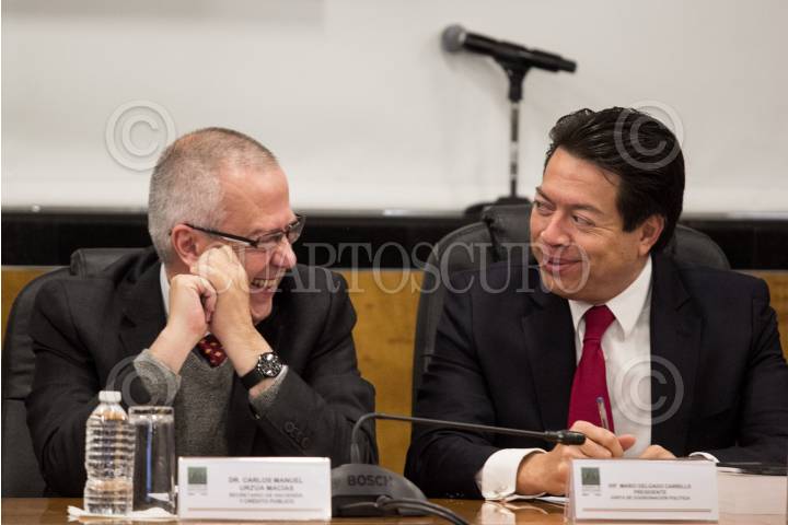 CIUDAD DE MÉXICO, 12DICIEMBRE2018.- Carlos Manuel Urzúa, secretario de Hacienda y Crédito Público, y Mario Delgado, coordinador morenista, durante su participación en la reunión permanente de la Comisión de Hacienda y Crédito Público de la Cámara de Diputados. FOTO: GALO CAÑAS /CUARTOSCURO.COM