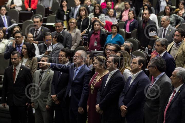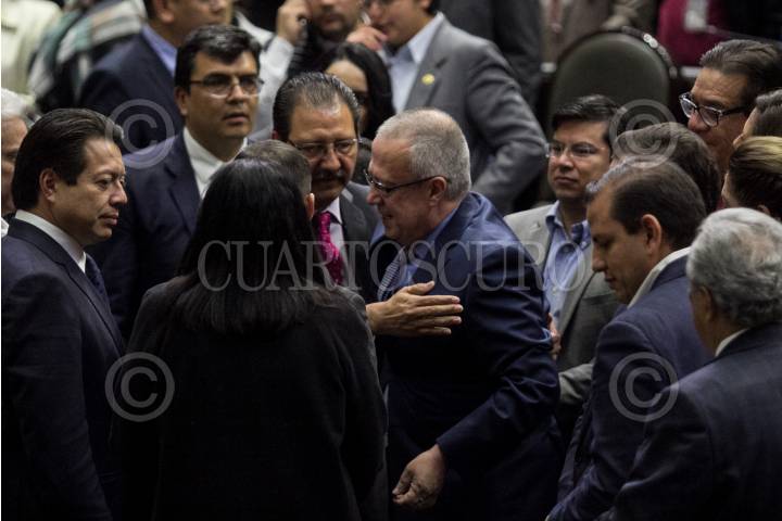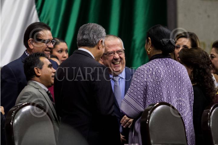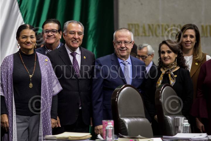 CIUDAD DE MÉXICO, 13DICIEMBRE2018.- Dulce María Sauri, vicepresidenta de la Cámara de Diputados; Marco Adame Castillo, vicepresidente de la Cámara, Carlos Manuel Urzúa, secretario de Hacienda y Crédito Público, y Dolores Padierna, vicepresidenta de la mes directiva, tras la toma de protesta del secretario. FOTO: GALO CAÑAS /CUARTOSCURO.COM