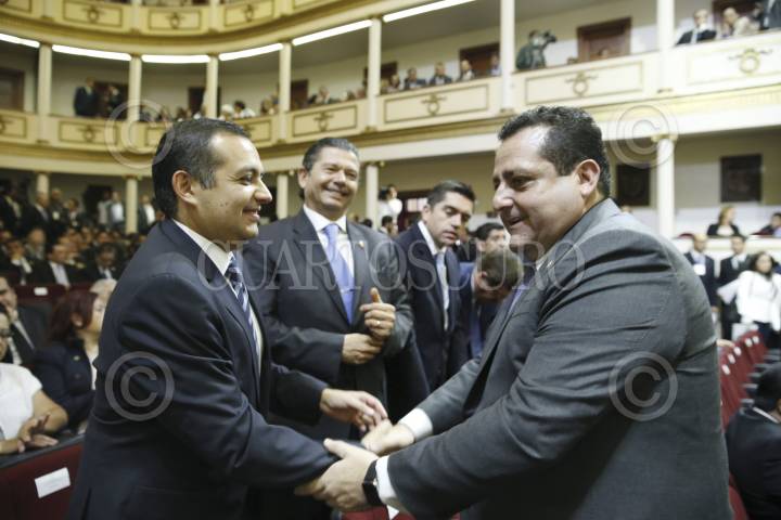 QUERÉTARO, QUERÉTARO, 01OCTUBRE2015.- El senador Ernesto Cordero saluda al gobernador de Baja California Sur Carlos Mendoza Davis durante la ceremonia de toma de protesta de Francisco Domínguez como gobernador constitucional de Querétaro. FOTO: CUARTOSCURO.COM