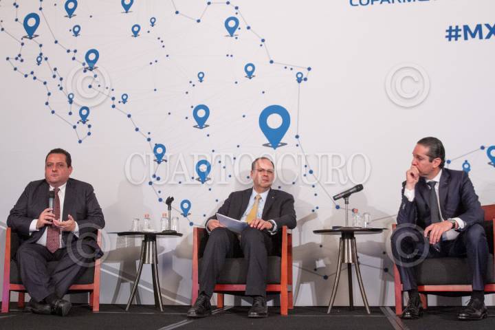 CIUDAD DE MÉXICO, 24MAYO2017.- Carlos Mendoza Davis, gobernador de Baja California Sur; Gustavo de Hoyos Walther, presidente de la Confederación Patronal de la República Mexicana (Coparmex), y Francisco Domínguez Servién, gobernador de Querétaro, durante el foro #Mxsincorrupción, organizado por la Coparmex. FOTO: MOISÉS PABLO /CUARTOSCURO.COM