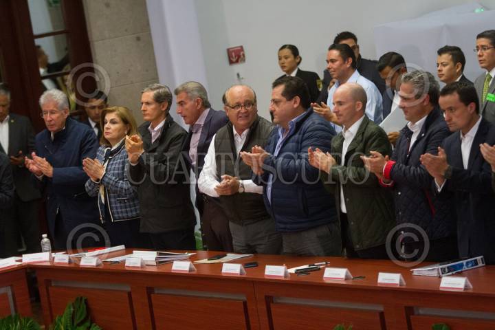 CIUDAD DE MÉXICO, 27SEPTIEMBRE2017.- Los gobernador Alfredo del Mazo Maza, Estadod e México; Antonio Gali Fayad, Puebla; Graco Ramírez, Morelos, y Carlos Mendoza Davis, Baja California Sur, durante la presentación de los avances para la reconstrucción de los estados afectados por los sismos y huracanes. FOTO: MOISÉS PABLO /CUARTOSCURO.COM