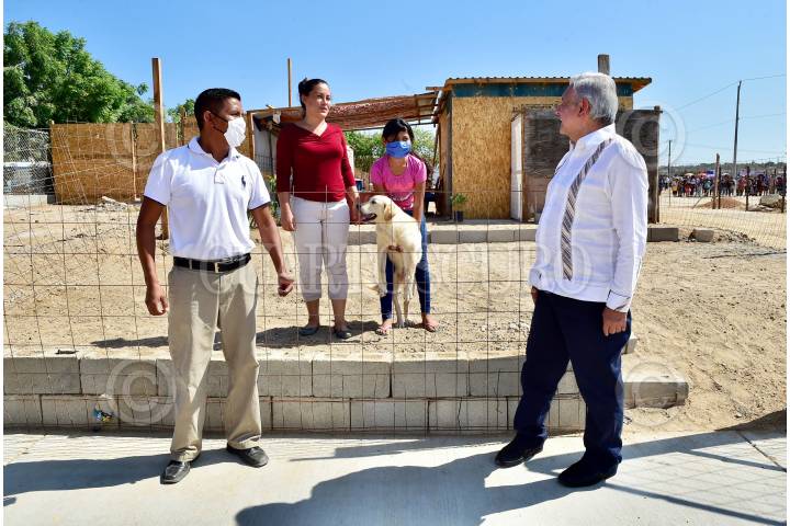 Román Meyer Falcón, , secretario de Desarrollo Agrario, Territorial y Urbano, Andrés Manuel López Obrador, presidente de México, y Carlos Mendoza Davis, gobernador de Baja California Sur, durante el recorrido por los trabajos del programa Mejoramie