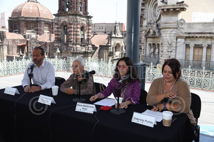 Henoc de Santiago, Beatriz Sánchez Monsiváis, Gabriela Pulido y Gloria Maldonado Ansó durante la conferencia de prensa para dar a conocer la exposición del fotógrafo de espectáculos Humberto Zendejas, titulada “La mirada oportuna”. Dentro de las actividades para recordar a Carlos Monsiváis a doce años de su partida.