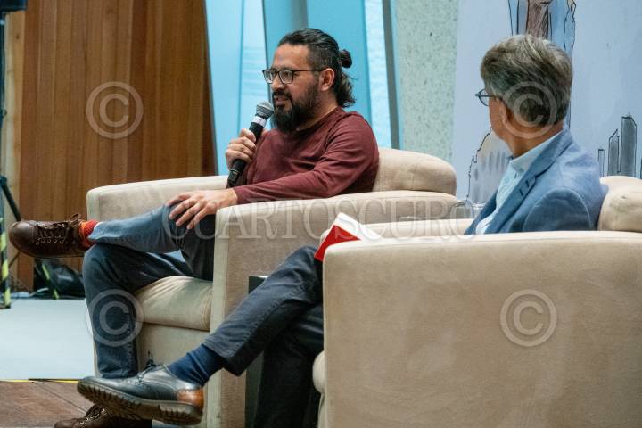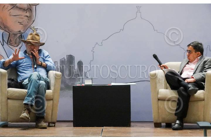 Jezreel Salazar y Jorge Carrasco Araizaga durante la mesa “Terremoto 85” durante la segunda jornada de diálogos, actividades y experiencias urbanas “La Ciudad y Monsiváis” con motivo del 85 aniversario de su natalicio.