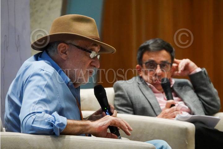 Javier Sicilia y Rafael Rodríguez Castañeda durante el cierre del conversatorioa "La Ciudad y Monsiváis" en el Espacio Cultural Infonavit