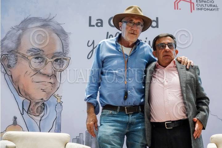 Carlos Martínez Velázquez, director general del Infonavit, y Rafael Barajas durante la conferencia magistral con motivo de la segunda jornada de diálogos, actividades y experiencias urbanas “La Ciudad y Monsiváis”