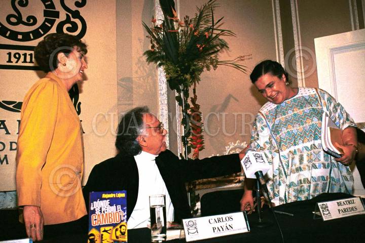 Durante la presentación del libro " Dónde se perdió el cambio" de Alejandra Lajous, Beatriz Paredes se despide de Carlos Payan exdirector del periodico la Jornada. FOTO: Eunice Adorno/CUARTOSCURO.COM