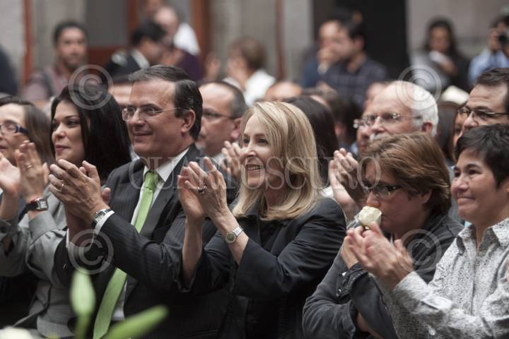 MÉXICO, D.F., 22MAYO2012.- Rosalinda Bueso, y su esposa el Jefe de Gobierno Marcelo Ebrard, acompaña a Silvia Lemus, esposa del recién fallecido Carlos Fuentes (1928-2012), durante el homenaje en el cual se anunció que el Museo de la Ciudad de México de hoy en adelante también se llevará el nombre del autor de Artemio Cruz. FOTO: MOISÉS PABLO /CUARTOSCURO.COM
