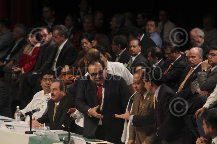 MÉXICO, D.F., 25MAYO2013.- Carlos Ramírez Marín, Secretario de Desarrollo Agrario, Territorial y Urbano (SEDATU), saluda a Miguel Ángel Mancera, Jefe de Gobierno del Distrtio Federal durante el Congreso Nacional con la Central Campesina. FOTO: SAÚL LÓPEZ / CUARTOSCURO.COM
