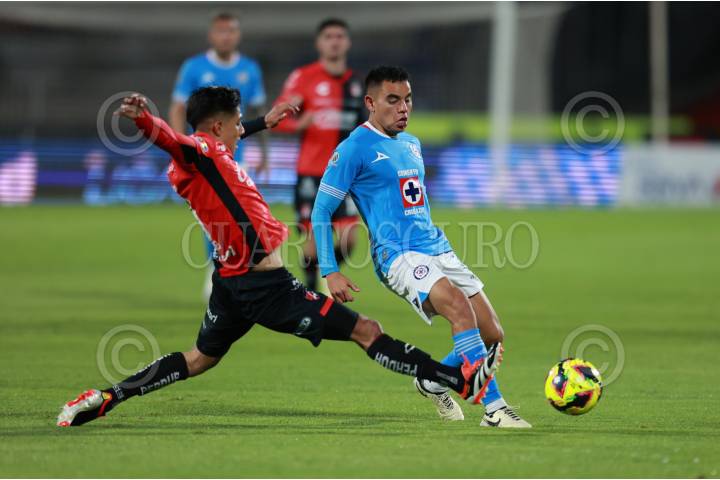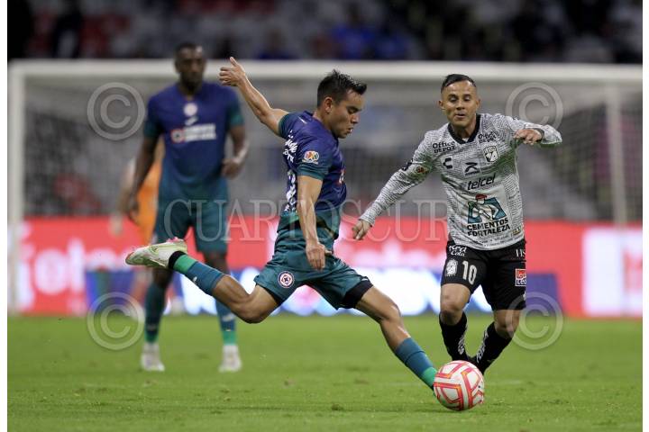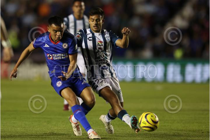 CIUDAD DE MÉXICO, 13ENERO2024. Carlos Rodríguez de Cruz Azul y Alan Bautista de Pachuca disputan una pelota durante el partido de fútbol Cruz Azul vs Pachuca correspondiente a la jornada 2 del Torneo Clausura 2024 de Liga BBVA MX, en el Estadio Ciudad de los Deportes. FOTO: EDGAR NEGRETE LIRA/CUARTOSCURO.COM