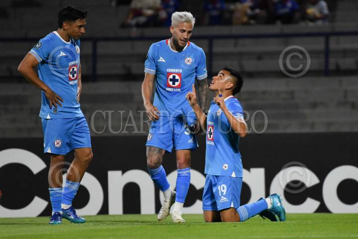 CIUDAD DE MÉXICO, 16JULIO2024. Festejo de jugadores José Rivero, Georgios Giakoumakis, Andrés Montaño y Carlos Rodríguez durante el partido de fútbol Cruz Azul vs Tijuana correspondiente a la jornada 3 del Torneo Apertura 2024 de Liga BBVA MX, en el Estadio Ciudad de los Deportes. FOTO: EDGAR NEGRETE LIRA/CUARTOSCURO.COM