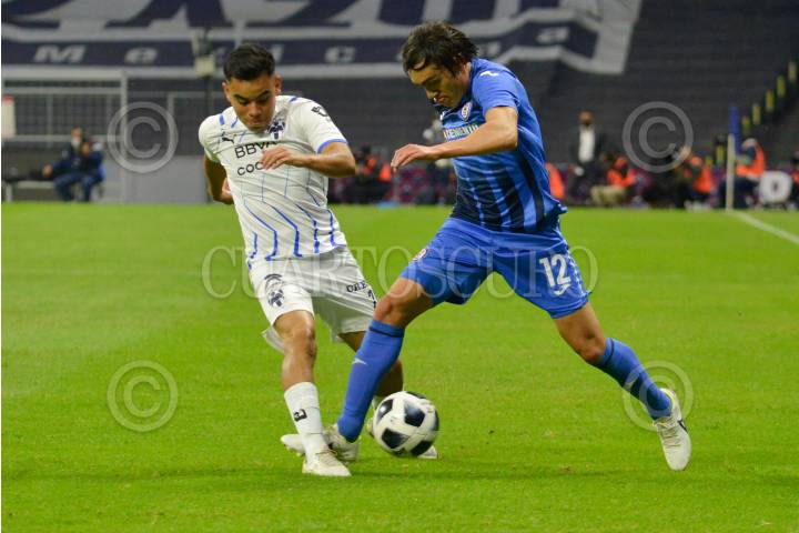 José Martínez, defensa lateral del Cruz Azul diputa el balón frente a Carlos Rodríguez, medio del Monterrey, durante el partido de repechaje del la Liga MX Apertura 2021.