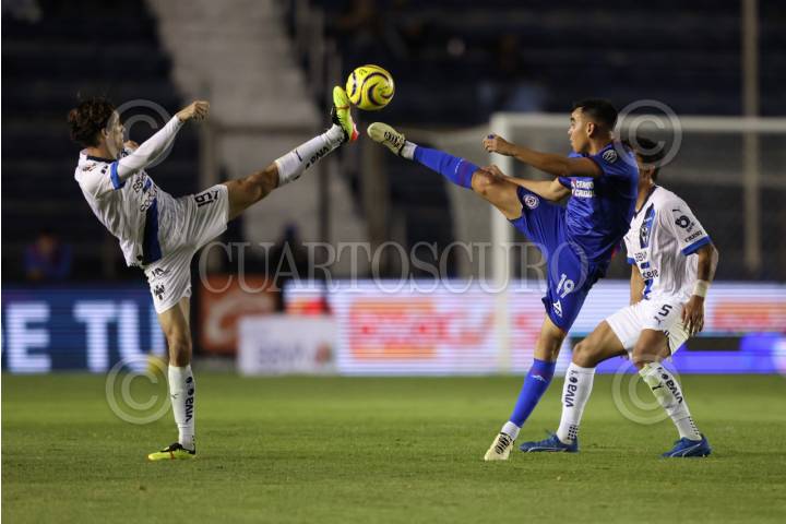 CIUDAD DE MÉXICO, 06ABRIL2024. Jordi Cortizo de Rayados y Carlos Rodríguez de la Maquina Celeste disputan una pelota durante el partido de fútbol Cruz Azul vs Monterrey correspondiente a la jornada 14 del Torneo Clausura 2024 de Liga BBVA MX, en el Estadio Ciudad de los Deportes. FOTO: EDGAR NEGRETE LIRA/CUARTOSCURO.COM
