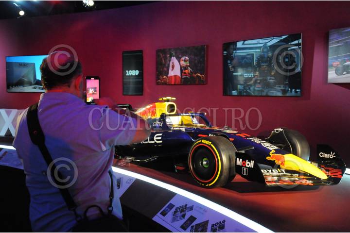 Una representación del monoplaza de Sergio "Checo" Pérez, el cual utiliza para las carreras de Fórmula 1, es exhibido en el Tianguis Turístico.